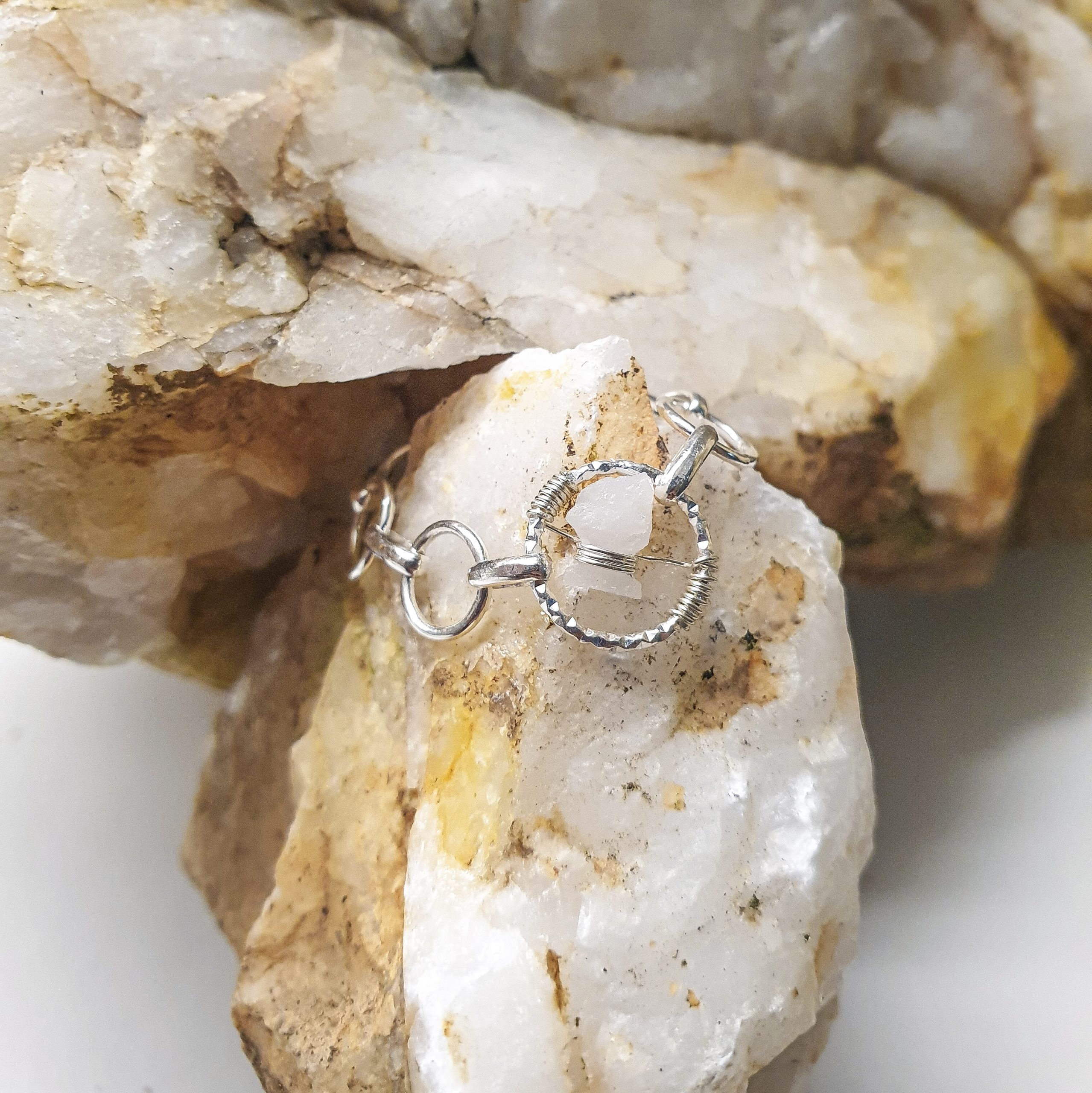 La bague Luna est réalisée avec un petit cristal taillé dans une pierre plus conséquente ramassée dans le canton des Grisons, en Suisse. L'anneau principal ainsi que les autres anneaux positionnés tout autour de la bague sont semblables à plusieurs petites pleines lunes. La pierre blanche et délicate qui orne la bague ressemble à petit flocon tombé à même le seul une nuit d'hiver. Ce bijou qui scintille et reflète la lumière se porte volontiers seul et pourquoi pas au majeur, à l'annuaire ou au pouce pour casser les habitudes !