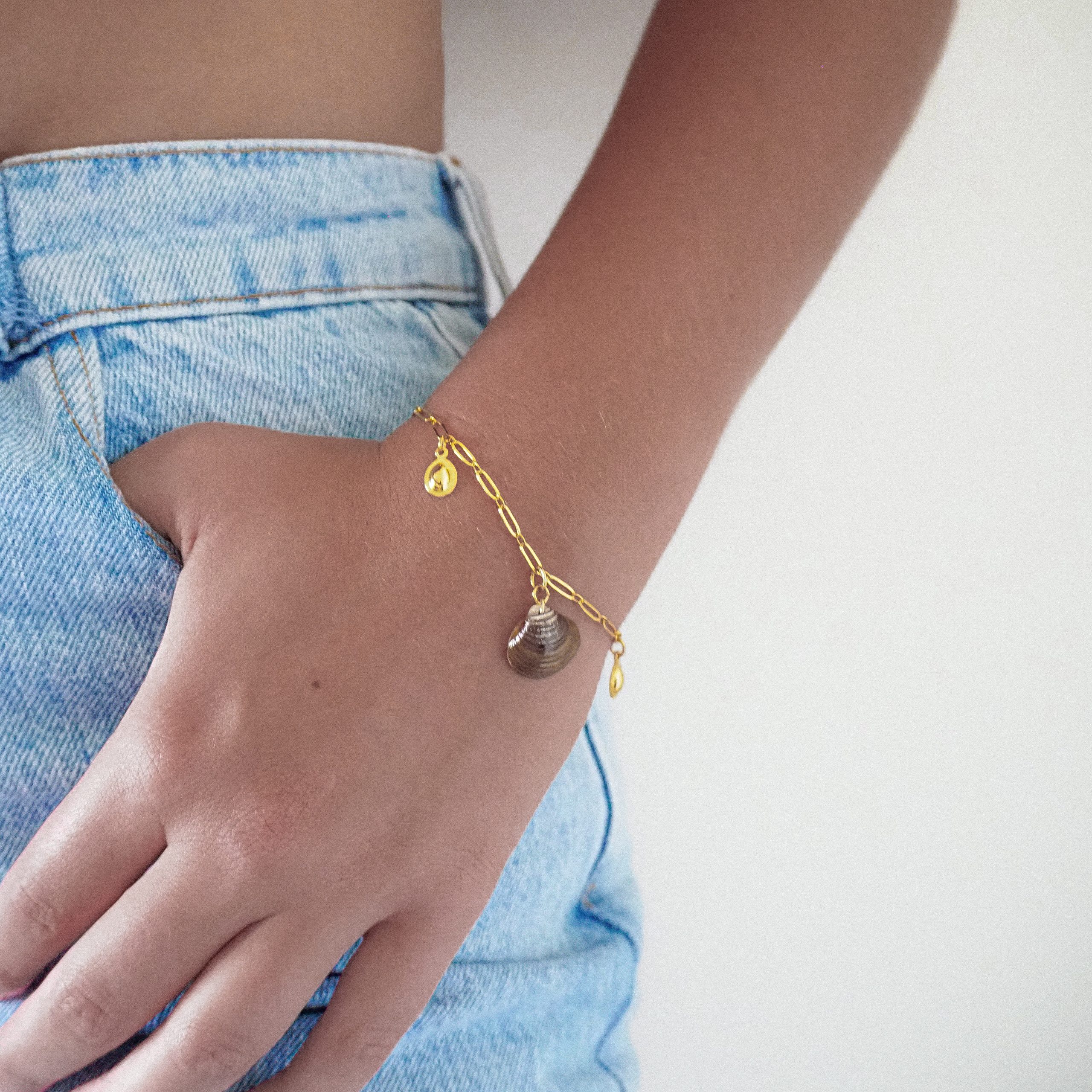 Le bracelet Thalassa est réalisé à partir d'une chaîne à larges maillons en plaqué or 3 microns. La taille du bijoux est réglable jusqu'à 19 cm afin que chacune puisse l'adapter à son poignet ! Deux petites breloques ainsi qu'un coquillage brun foncé ornent le bijou et virevolte au gré des mouvements et du vent. Le coquillage a été déniché à Yverdon un jour où le lac s'était reculé et avait dévoilé toutes ces petites merveilles posées sur le sol. Le doré du bracelet se marie parfaitement avec un teint hâlé par le soleil des vacances. Les couleurs du bracelet et son coquillage font penser à un trésor découvert au fin fond de l'océan, bien enfoui dans le sable et caché au milieu des algues !
