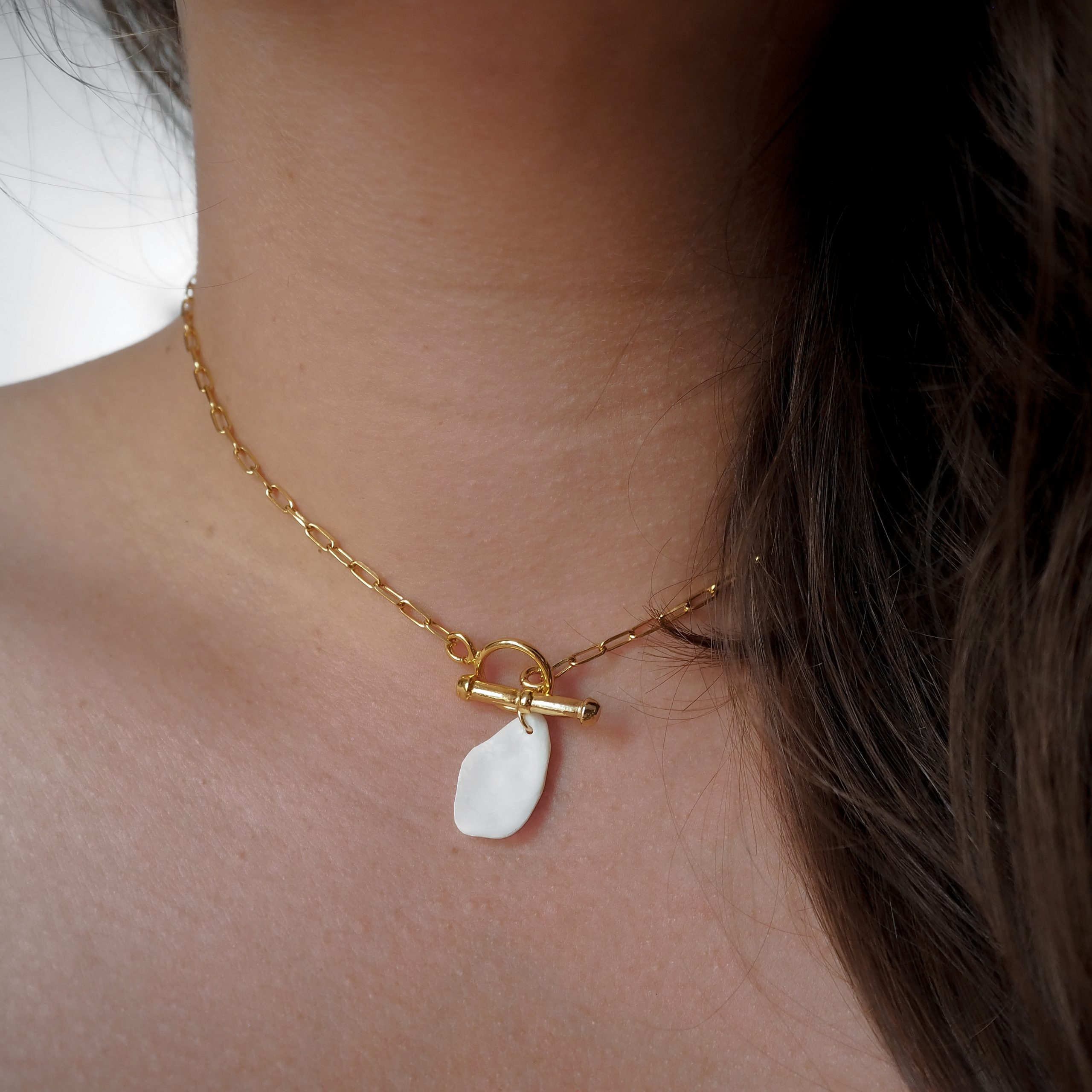 Le collier Nausicaa est composé d'une chaîne en plaqué or 3 microns de 42 cm. Il se porte au ras du cou et se ferme sur le devant avec le morceau de nacre qui vient se poser entre les deux clavicules. Ce morceau de nacre a été ramassé au bord de l'océan, en Bretagne, lorsque ce dernier se retirait et laissait paraitre pour quelques heures tous ces merveilleux trésors. La couleur dorée de la chaîne rappelle le soleil lors des chaudes journées d'été et la nacre blanche faire ressortir les restes du bronzage. Ce bijou se porte facilement avec un t-shirt blanc à col en V ou d'autres hauts à épaules dénudées afin de le mettre en valeur. Il complète également à ravir une marinière pour un total look petit marin !